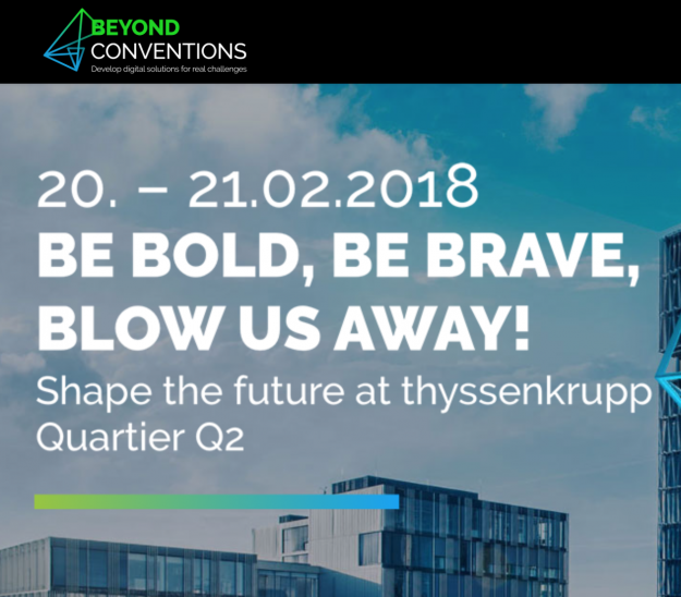 Smartfurniture ist dabei!Am 20/21. Februar findet in Essen das unkonventionelle Start-up-Pitch-Event Beyond Conventions statt. Die fünf sehr gewichtigen Unternehmen Funke Medien NRW, Innogy, Opengrid Europe, thyssenkrupp und Schacht One (Haniel) präsentieren im Rahmen der Veranstaltung aktuelle Probleme, für die sie Lösungen suchen. Wir pitchen am 21.2.2018 in der Kategorie „Smart office Equipment“ mit Eliot!